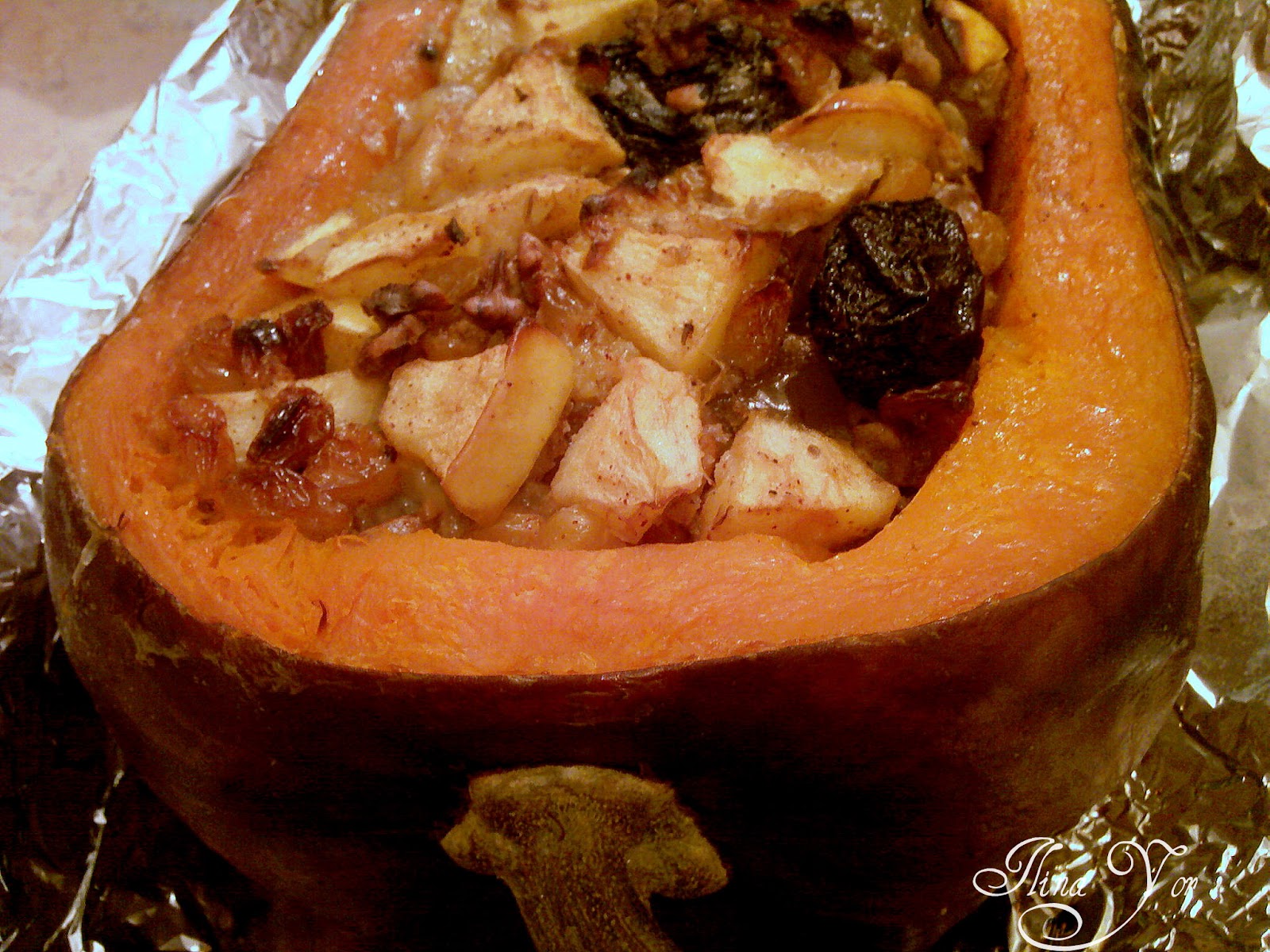 Изчистената отвътре тиква се пълни...  Всичко добавях на око и се оказа, че съм попрекалила с плънката. Наложи се лекичко да я понатъпча, което предполагам поврежда вкуса й и я сбива, но пак си беше вкусна. Сушените и пресни плодове, както и ядките са по избор и естествено грамажа им зависи от тиквата.